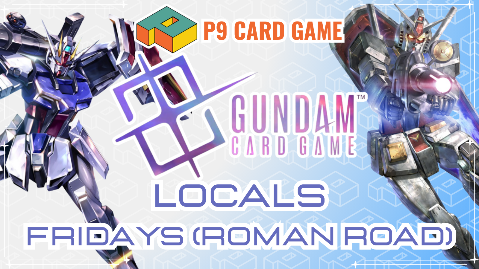 Charge up your mech and get ready to go turbo for Gundam Locals at P9 Card Game. Registration from 6, play starts at 7. Any Gundam TCG product will grant entry to the locals event! Please disregard all the information on the Bandai official website. Gundam locals are on FRIDAY NIGHTS at ROMAN ROAD.