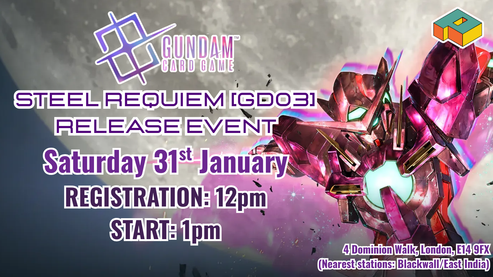 Charge up your mech and get ready to go turbo for Gundam Locals at P9 Card Game. Registration from 6, play starts at 7. Any Gundam TCG product will grant entry to the locals event! Please disregard all the information on the Bandai official website. Gundam locals are on FRIDAY NIGHTS at ROMAN ROAD.